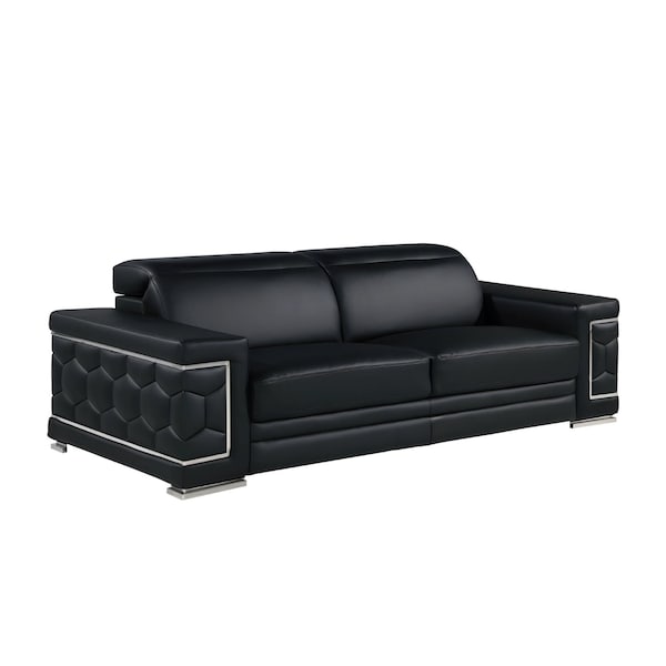 Superior construction from fabulously soft and high grade leather gives this 89-inch black leather sofa with silver legs a leg up on the competition. The premium leather used makes your lounging luxuriously comfortable and adds an elegant appeal to your space. Solid colors give you lots of decorative options and are easy to work into your decor scheme. Coil spring construction gives this piece strong support and makes it comfortable to sit even for long periods of time. Square arms offer a comfy place to rest. Silver stainless steel legs effortlessly elevate the room and add a touch of contemporary design. A great showpiece for your room, this sofa is a must have. 29-inch H x 89-inch W x 41-inch D