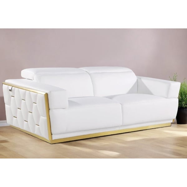 Superior construction from fabulously soft and high grade Italian leather gives this 89-inch white and gold leather sofa a leg up on the competition. The premium leather makes your lounging luxuriously comfortable and adds an elegant appeal to your space. The wide arms offer a comfy place to rest, while the tufted stitching on the sides brings in a hint of art deco design sense. Finished off with gold trim that creates a contemporary chic color combination. A great showpiece for your room, this sofa is a must have. 40-inch H x 89-inch W x 43-inch D