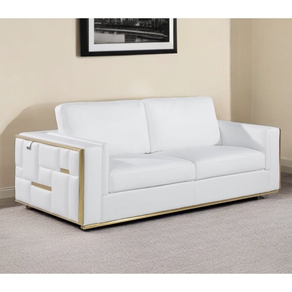 Superior construction from fabulously soft and high grade leather gives this 89-inch white italian leather sofa with brass legs a leg up on the competition. The premium leather used makes your lounging luxuriously comfortable and adds an elegant appeal to your space. Solid colors give you lots of decorative options and are easy to work into your decor scheme. Sinuous springs construction gives this piece strong support and makes it comfortable to sit even for long periods of time. Removable back cushions make this sofa easy to manage. Square arms offer a comfy place to rest. Brass stainless steel legs effortlessly elevate the room and add a touch of contemporary design. A great showpiece for your room, this sofa is a must have. 40-inch H x 89-inch W x 34-inch D