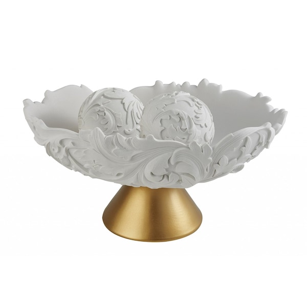 Add an air of fashion to your room and rejuvenate the space with this 9" matte gold and white polyresin decorative bowl with orbs. This matte gold and white hued piece represents high quality, expertly made from high grade polyresin. A perfect decorative addition for anyone who loves a stylish look and feel. You can be certain that you'll be leaving an impression with this unique piece. 8.75" H x 9" W x 15.25" D