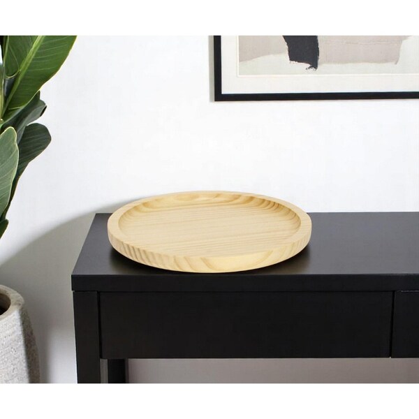 This 9-inch natural solid wood handmade round vanity tray is beautiful enough to be left out on the counter or shelf when not in use. Intended for decorative, non-food use only, it's perfect for displaying a collection of candles, perfume, décor, and more. The sleek modern style effortlessly complements various interior themes, while the rich natural color enhances the beauty of any space. Its sturdy construction ensures durability, making it a functional yet elegant addition to your home decor collection. 0.75-inch h x 9-inch w x 9-inch d.