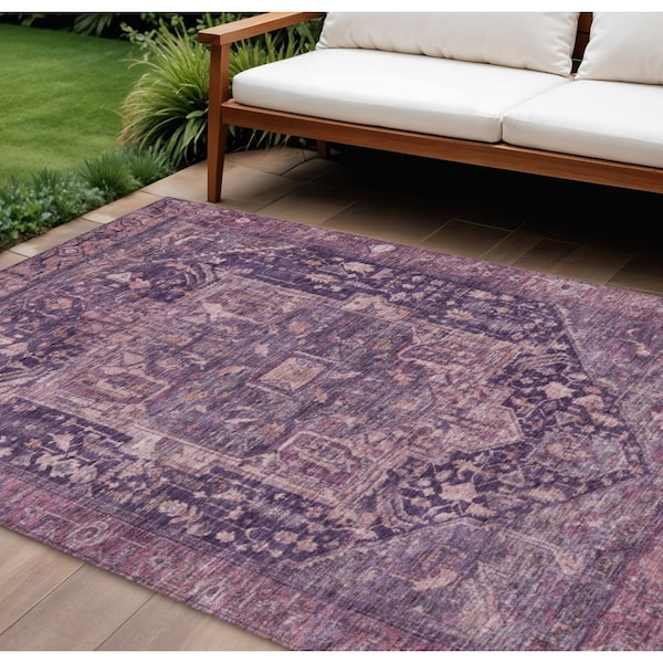 Set an inviting tone in your space with this 9-foot x 12-foot eggplant medallion washable indoor outdoor area rug. This rectangle shaped rug features a medallion design that will work well both indoors or out. A classic shape marries with good looking design for your living room, hall, bedroom, porch, patio, or poolside. Ideal for outdoor spaces or high traffic areas with kids and pets, this rug is made from heavy duty polyester that is stain resistant to help repel water, dirt, and stains. Makes a great way to dress up your patio, porch, or poolside, but also works well as a durable and easy to maintain option in the kitchen, family room, or mudroom. 108-inch h x 144-inch w x 0.19-inch d.