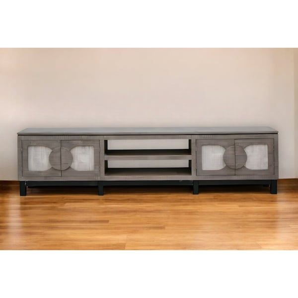 Create the ultimate blend of style, function, and design with this 93" gray solid wood cabinet enclosed storage distressed tv stand. Curated from a mix of high quality solid pine wood and durable manufactured wood, this console is beautiful, and built to last. Due to the genuine nature of the wood some natural wood knots, and grain and color variations may occur. To add to the versatility, this piece features open non-concealed storage that can be used for not only storage but display as well. Built-in cable and wire management helps to keep those unseamly wires at bay. Ideal for tv placement and storage in your living room, bedroom or office. 27" H x 92.5" W x 15.75" D