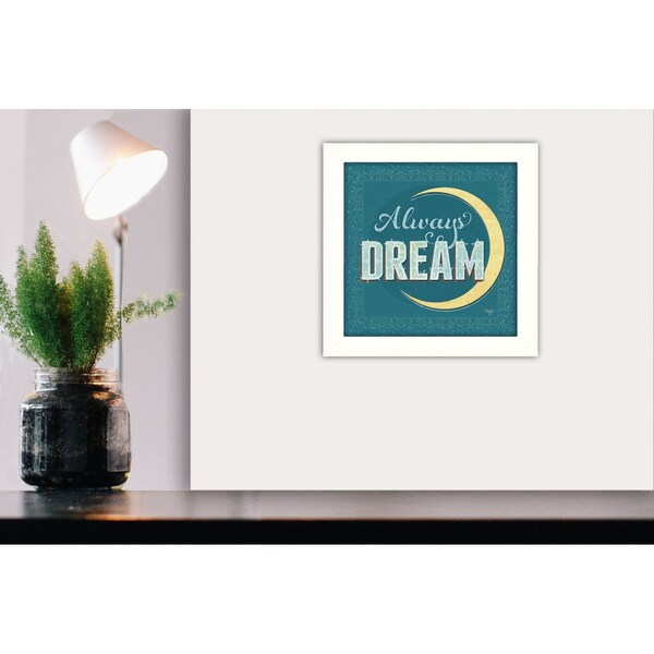 Add an air of fashion to your room and rejuvenate the space with this always dream white framed print wall art. This print is a visual artistic expression that allows you to decorate your space in style. Reproduced for you on paper, this hanging decorative accent will be a trendy and fashionable way to dress your walls. Hang on your wall to add some up to date fashion and decoration. Utilize this opportunity to create a focal point in the room with this fabulous wall decor option. 14-inch H x 14-inch W x 1-inch D