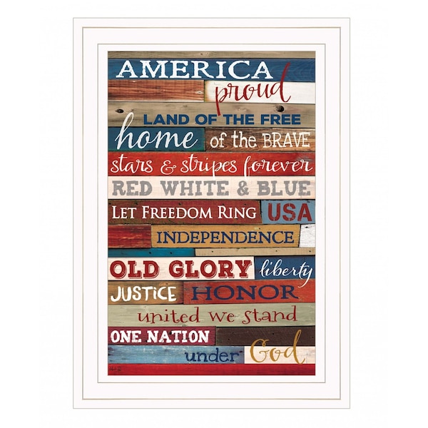 Bring some sizzle to your space with this eye-catching america proud 2 white framed print wall art. This print is a visual artistic expression that allows you to decorate your space in style. Reproduced for you on wood, this hanging decorative accent will be a trendy and fashionable way to dress your walls in a rustic and modern farmhouse vibe. Hang on your wall to add some up to date fashion and decoration. Utilize this opportunity to create a focal point in the room with this fabulous wall decor option. 19-inch H x 15-inch W x 1-inch D