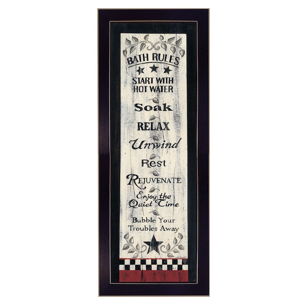 The bath rules 6 black framed print bathroom wall art is the perfect decorative accessory for your home. This print is a visual artistic expression that allows you to decorate your space in style. Reproduced for you on paper, this hanging decorative accent will be a trendy and fashionable way to dress your walls. Hang on your wall to add some up to date fashion and decoration. Instantly liven up your space with this art that brings color and dimension to your walls. 26-inch H x 10-inch W x 1-inch D
