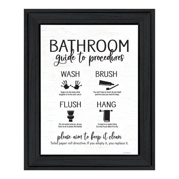 Bring some sizzle to your space with this eye-catching bathroom guide black framed print bathroom wall art. This print is a visual artistic expression that allows you to decorate your space in style. Reproduced for you on wood, this hanging decorative accent will be a trendy and fashionable way to dress your walls in a rustic and modern farmhouse vibe. Adding this hanging wall art to your space to make your room feel more finished and attractive. Utilize this opportunity to create a focal point in the room with this fabulous wall decor option. 19-inch H x 15-inch W x 1-inch D