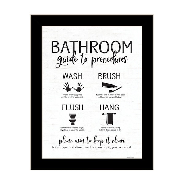 Bring some sizzle to your space with this eye-catching bathroom guide black framed print bathroom wall art. This print is a visual artistic expression that allows you to decorate your space in style. Reproduced for you on wood, this hanging decorative accent will be a trendy and fashionable way to dress your walls in a rustic and modern farmhouse vibe. Adding this hanging wall art to your space to make your room feel more finished and attractive. Instantly liven up your space with this art that brings color and dimension to your walls. 18-inch H x 14-inch W x 1-inch D