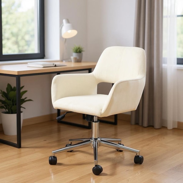 Beige and Silver Upholstered and Steel Adjustable Swivel Rolling Office Chair