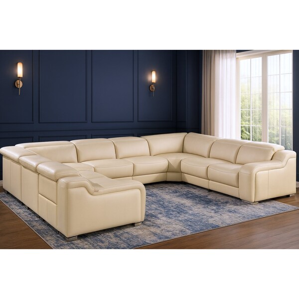 Superior construction from fabulously soft and high-grade leather gives this beige italian leather power reclining u shaped eight piece corner sectional with console a leg up on the competition. The premium leather used makes your lounging luxuriously comfortable and adds an elegant appeal to your space. Solid colors give you lots of decorative options and are easy to work into your decor scheme. Square arms offer a comfy place to rest. Power - push button recline allows you to truly rest, lounge and even sleep comfortably. Silver metal legs effortlessly elevate the room and add a touch of contemporary design. A great showpiece for your room, this sectional is a must have. 39.00-inch h x 161.00-inch w x 85.00-inch d.