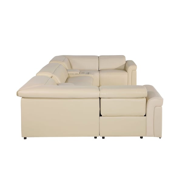 An interior designer's dream, this buttery soft high-grade leather beige Italian leather power reclining u shaped eight piece sectional with console will bring just the right touch to your space. The premium leather used makes your lounging luxuriously comfortable and adds an elegant appeal to your space. This sectional includes four power recliners and lots convenient amenities. Square arms offer a comfy place to rest. Power - push button recline allows you to truly rest, lounge and even sleep comfortably. Black metal legs effortlessly elevate the room and add a touch of contemporary design. A great showpiece for your room, this sectional is a must have. 39.00-inch h x 172.00-inch w x 82.50-inch d.