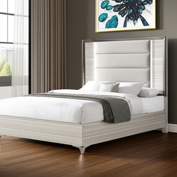 Beige White And Chrome Wood Upholstered Lighted King Bed Frame