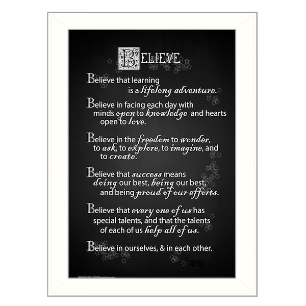This believe 1 white framed print wall art will add a beautiful decorative accent to your decor. This print is a visual artistic expression that allows you to decorate your space in style. Reproduced for you on paper, this hanging decorative accent will be a trendy and fashionable way to dress your walls. Hang on your wall to add some up to date fashion and decoration. Utilize this opportunity to create a focal point in the room with this fabulous wall decor option. 10-inch H x 14-inch W x 1-inch D