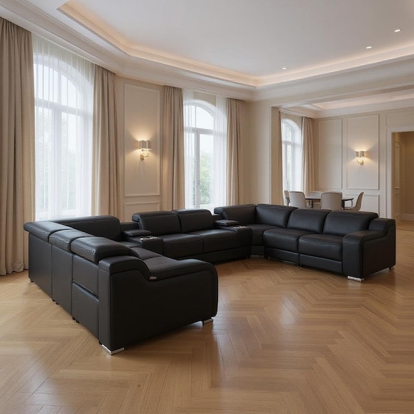 Take your relaxation to the next level with this super soft and comfortable black italian leather power reclining u shaped ten piece corner sectional with console. The high-end premium leather used makes your lounging luxuriously comfortable and adds an elegant appeal to your space. Solid colors give you lots of decorative options and are easy to work into your decor scheme. Square arms offer a comfy place to rest. For the ultimate in relaxation, this sectional includes power - push button recline that turns it into a comfy lounge for sleeping or resting. Silver metal legs effortlessly elevate the room and add a touch of contemporary design. Great for everyday lounging and for entertaining, sectionals are an ideal way to seat multiple people. 39.00-inch h x 161.00-inch w x 138.00-inch d.