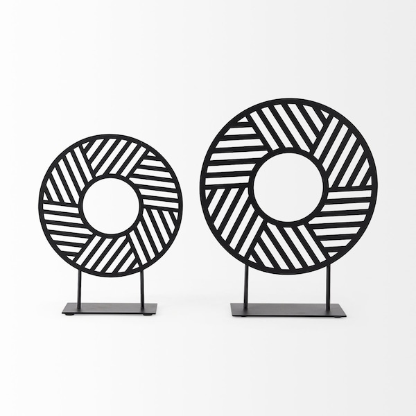 With this Black Metal Round Geometric Sculptureyou can add the perfect touch of art-inspired contemporary design to your home. This sculpture is made from solid metal and features a round shape sitting on a stand in a matte black color. The stand is a thin metal rectangle with two metal rods coming up from it. The circular shape has a hollow round middle with a geometric line design cut out in it. You can display this decor piece anywhere in your home without worrying about clashing colors or interior styles. Use it with similar decor pieces or as a stand-alone piece, it will look great nonetheless. 13" H x 3" W x 11" D