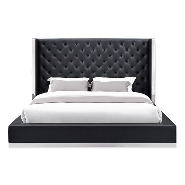 Add a luxuriously appointed bed that will help you create an oasis of comfort and relaxation in your home with this black tufted faux leather king bed frame. This fully upholstered bed frame is covered in a beautiful button tufted black faux leather that brings a unique and special touch to your room. Quality craftsmanship in every facet of production ensures durability and long-lasting wear. This bed will help to create a peaceful environment that will provide restful slumber for years to come. Features high quality design that adds a modern vibe to your space. Modern styling gives this bed a clean and fresh style. 60-inch h x 91-inch w x 91-inch d.