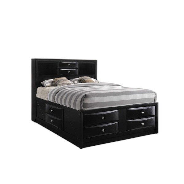 Update and anchor your room in style with the fabulous black wood queen with ten drawers bed frame. The versatile rectangular bookcase style headboard gives this bed easy access storage and display that is convenient and fashionable. Quality craftsmanship in every facet of production ensures durability and long-lasting wear. Built to last, this piece not only looks good but reflects premium workmanship from top to bottom. This bed is the perfect way to make your bedroom comfortable and inviting. 56-inch h x 91-inch w x 63-inch d.
