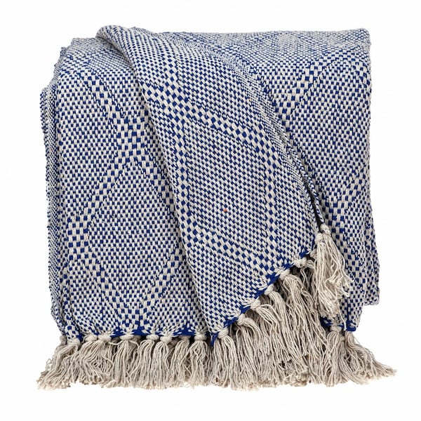 Blue and Beige Woven Handloom Throw with Tassels