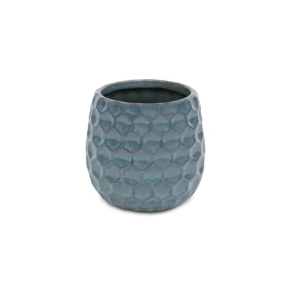 The handmade blue ceramic 15 ounce round distressed pot planter is an elegant addition to your indoor decor. This charming round pot planter is crafted from high-quality ceramic, ensuring durability while making a stylish statement. The geometric texture, reactive glaze, and purposeful distressing adds a charming vintage touch that enhances its aesthetic appeal. With an interior height of 4.5 inches, it is perfect for showcasing small plants or herbs. Its versatile design allows it to complement various styles, whether modern or traditional. Brighten up your living space with this stunning planter that beautifully blends functionality with aesthetic appeal. Enhance your home with the perfect setting for your greenery, transforming any room into a vibrant oasis. 4.25-inch h x 4.50-inch w x 4.50-inch d.