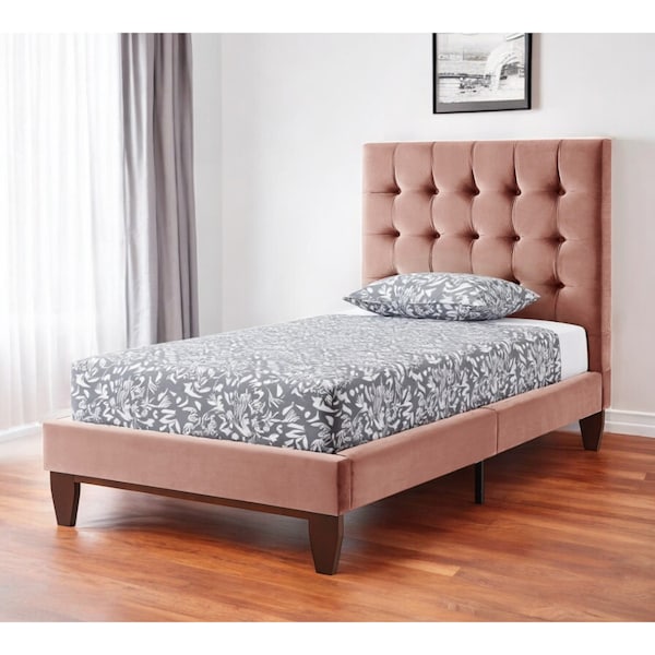 Create a haven for relaxation and sweet dreams with this fabulous blush solid wood twin tufted upholstered velvet bed. Fully upholstered in a blush button tufted velvet, this bed brings a unique and designer perspective to your space. Quality craftsmanship in every facet of production ensures durability and long-lasting wear this bed will help to create a peaceful environment that will provide restful slumber for years to come. 50-inch H x 84-inch W x 44.5-inch D