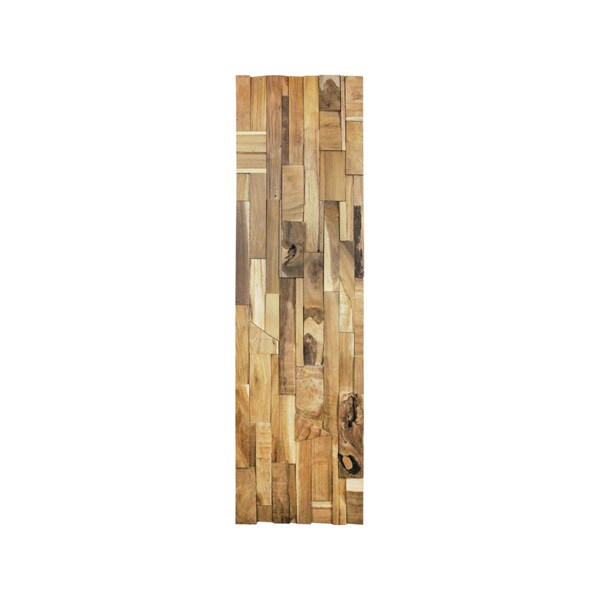 Transform your space from ordinary to extraordinary with these easy to install eco-conscious panels. Individually hand-crafted from a mix of of genuine and reclaimed teak wood that is applied to a manufactured wood substrate, these wall panels showcases a striking 3D embossed and textural geometric abstract design that adds depth and character to any room. Featuring natural wood grain color variation, each piece delivers a unique look that reflects the beauty of reclaimed wood. The use of teak offers durability and elegance, ensuring that your decor remains timeless and stylish. This set includes four individual pieces that easily install to create a visually appealing display that elevates your interior design while allowing for creative expression in your home décor.