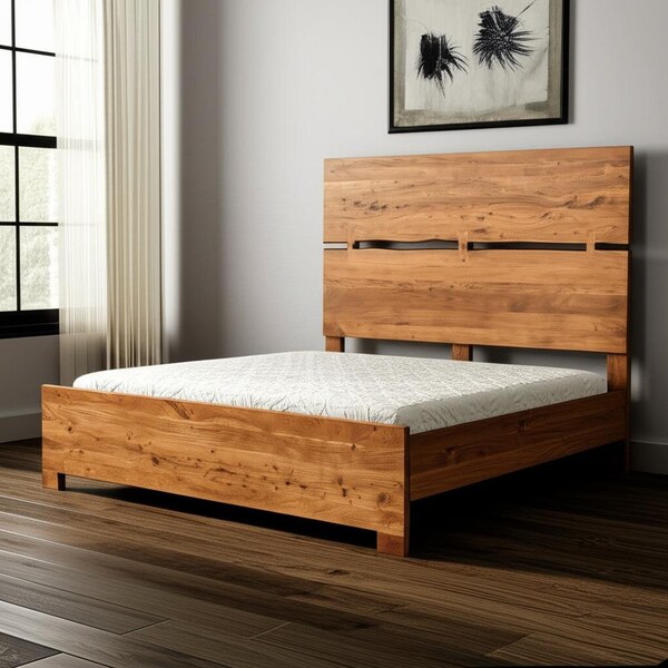 Update and anchor your room in style with the fabulous brown live edge solid wood king bed frame. Built to last from premium solid acacia wood, this piece not only looks good but reflects premium workmanship from top to bottom. The mid split head board with a wood bow joint gives this bed a unique and special look. We spend so much time in our bedrooms, thus making quality craftsmanship and good looks vitally important. This bed will help to create a peaceful environment that will provide restful slumber for years to come. 70-inch h x 80-inch w x 85-inch d.