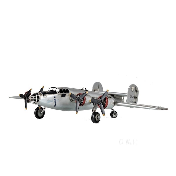 Authentic and super realistic, c1940 B-24 Liberator Bomber Sculpture is a replica of the No.1 heavy bomber of the U.S. Air Force during WWII. It was used for bombing raids in Europe and the Pacific. Made from a metal construction and a clean silver paint finish it is a remarkable collection piece. The rotating propellers and realistic Air Force decals make it super desirable for aviation and WWII enthusiasts. 3.75" x 13.25" x 21.25"