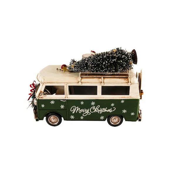 An authentic and jolly replica of the favorite van of the 60's, the c1960s Volkswagen Christmas Bus Sculpture is a handmade model made of metal and decorated in the spirit of Christmas. It features rolling wheels, beautiful interior details like seats, steering wheel, and gas pedal. Painted in authentic white and green, and on the roof rack, there is a realistic Christmas tree and presents. Perfect decoration piece for shelves or bedside table. 11'' x 13.5'' x 5.5"