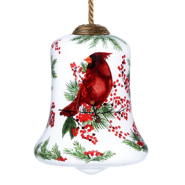 Reassure yourself to know that your loved one is always by your side even during life's most precious moments with the Cardinal Perched on Winter Berries Hand Painted Mouth Blown Glass Ornament. Using old world intricate techniques, the glass is hand-painted on the inside by skilled artisans. This gorgeous bell shaped ornament will be a treasured keepsake for your tree but can also be hung easily on an ornament stand. 4" x 3" x 3"