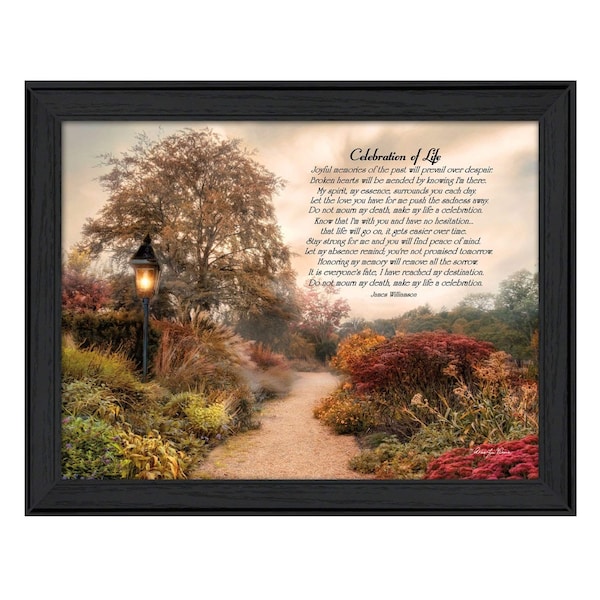 The celebration of life black framed print wall art is the perfect decorative accessory for your home. This print is a visual artistic expression that allows you to decorate your space in style. Reproduced for you on paper, this hanging decorative accent will be a trendy and fashionable way to dress your walls. Hang on your wall to add some up to date fashion and decoration. Utilize this opportunity to create a focal point in the room with this fabulous wall decor option. 15-inch H x 19-inch W x 1-inch D