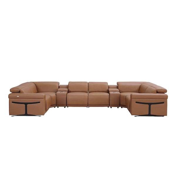 Superior construction from fabulously soft and high-grade leather gives this chestnut Italian leather power reclining u shaped eight piece corner sectional with console a leg up on the competition. The premium leather used makes your lounging luxuriously comfortable and adds an elegant appeal to your space. This sectional includes two power recliners and lots convenient amenities. Square arms offer a comfy place to rest. Power - push button recline allows you to truly rest, lounge and even sleep comfortably. Silver metal legs effortlessly elevate the room and add a touch of contemporary design. A great showpiece for your room, this sectional is a must have. 39.00-inch h x 172.00-inch w x 82.50-inch d.