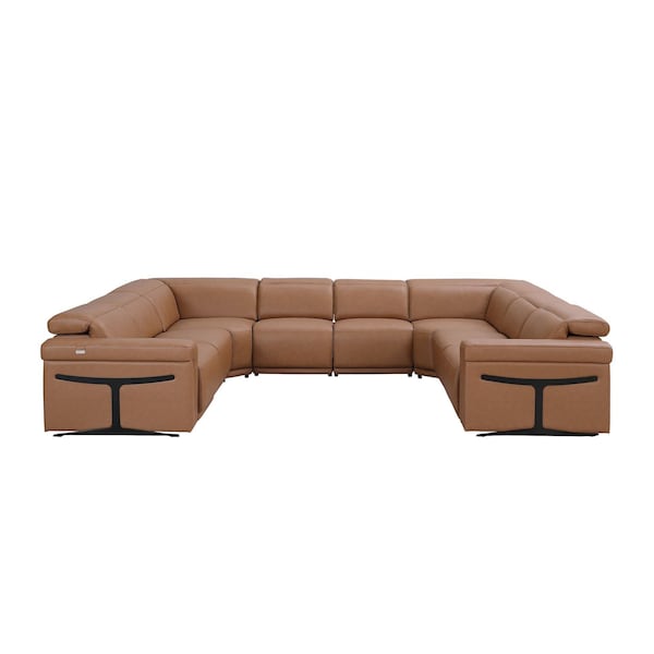 Superior construction from fabulously soft and high-grade leather gives this chestnut Italian leather power reclining u shaped eight piece corner sectional with console a leg up on the competition. The premium leather used makes your lounging luxuriously comfortable and adds an elegant appeal to your space. Square arms offer a comfy place to rest. For the ultimate in relaxation, this sectional includes four push button power recliners that turn it into a comfy lounge for sleeping or resting. Silver metal legs effortlessly elevate the room and add a touch of contemporary design. 39.00-inch h x 146.00-inch w x 109.50-inch d.
