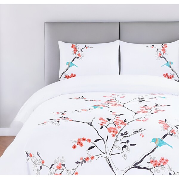 Coral and White Queen 100% Cotton 200 Thread Count Washable Duvet Cover Set