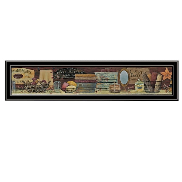 Unique and decorative, this country bath shelf 3 black framed print bathroom wall art will leave a lasting impression. This print is a visual artistic expression that allows you to decorate your space in style. Reproduced for you on paper, this hanging decorative accent will be a trendy and fashionable way to dress your walls. Hang on your wall to add some up to date fashion and decoration. Utilize this opportunity to create a focal point in the room with this fabulous wall decor option. 9-inch H x 39-inch W x 1-inch D