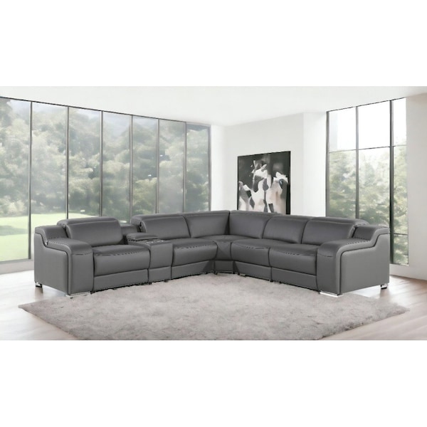 The dark gray italian leather power reclining l shaped six piece corner sectional with console is spacious design meticulously crafted with extraordinary cushion comfort and ultimate durability so everyone in your home can have the best seat in the house. The high-end premium leather used makes your lounging luxuriously comfortable and adds an elegant appeal to your space. Solid colors give you lots of decorative options and are easy to work into your decor scheme. Round arms offer a comfy place to rest. Power - push button recline allows you to truly rest, lounge and even sleep comfortably. Black metal legs effortlessly elevate the room and add a touch of contemporary design. A great showpiece for your room, this sectional is a must have. 39-inch H x 112-inch W x 125-inch D