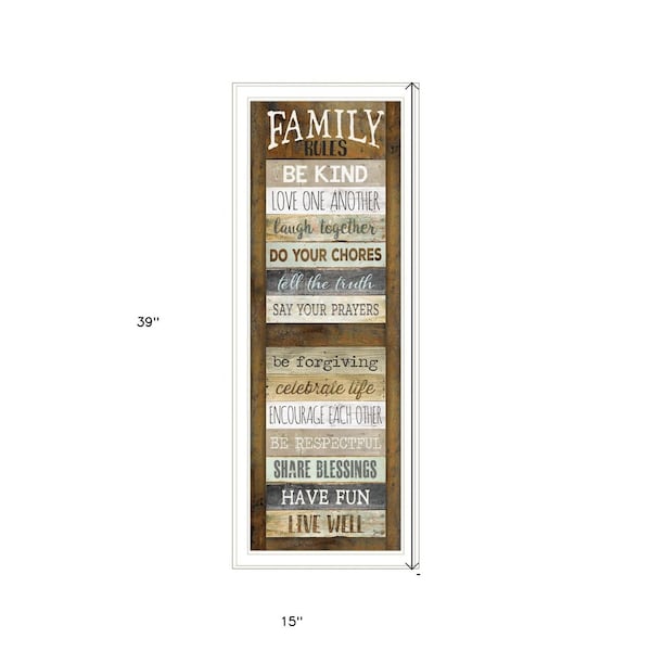 Bring some sizzle to your space with this eye-catching family rules shutter 2 white framed print wall art. This print is a visual artistic expression that allows you to decorate your space in style. Reproduced for you on paper, this hanging decorative accent will be a trendy and fashionable way to dress your walls. Hang on your wall to add some up to date fashion and decoration. Utilize this opportunity to create a focal point in the room with this fabulous wall decor option. 39-inch H x 15-inch W x 1-inch D