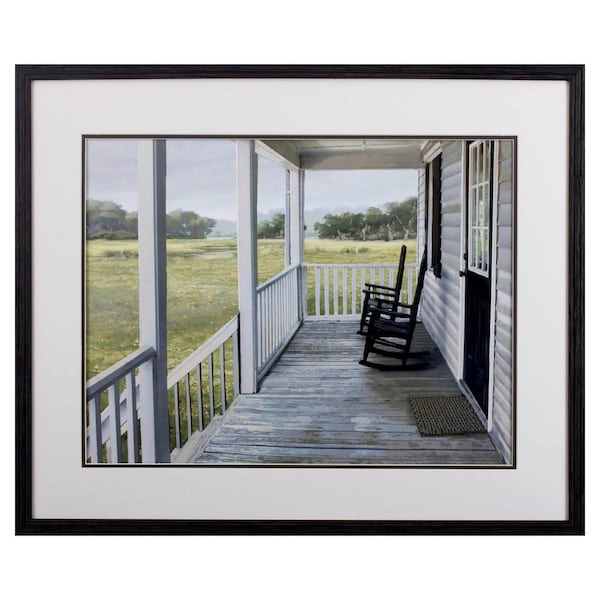 Farmhouse Back Porch Scene Wall Art is a great way to bring that country feel into your space. Triple matted and framed under glass in a textured black frame, this farmhouse look will be a great addition to any living room, bedroom, entranceway, or office. 26" x 32" x 2".