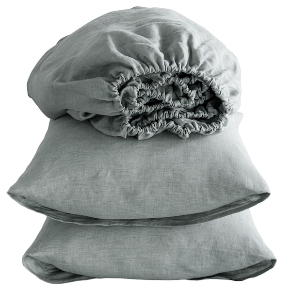 Experience hotel-quality comfort at home. This four piece blue linen king sheet set is perfect for creating a luxurious retreat. Indulge in simplicity and serenity with these exquisite solid color bed sheets. Crafted from premium quality linen that is known for its moisture wicking properties to keep you cool and comfortable, these sheets are a luxury but so worth it. They are breathable, have a soft thick texture that will get softer over time, and are wrinkle resistant (not wrinkle free). Crafted with care for a peaceful night’s sleep. 16-inch H x 80-inch W x 76-inch D