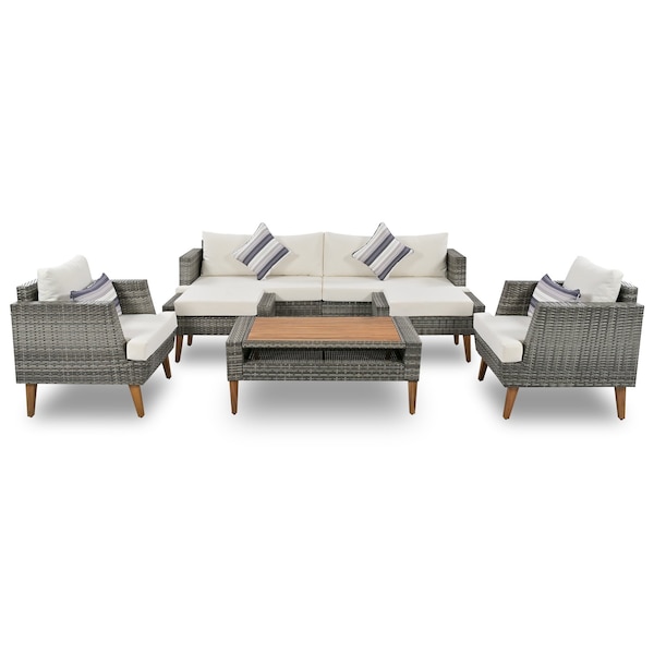 Add a touch of natural charm to your outdoor space with the wicker rattan outer frame. Create a welcoming atmosphere with the included outdoor bench, as it invites guests to sit, unwind, and appreciate the beauty of nature in your outdoor oasis. The inclusion of a coffee table acts as a central point, bringing together your seating arrangement and creating a cohesive and inviting atmosphere. Snuggle up with your loved one on the cozy loveseat from this set to create the perfect atmosphere in your outdoor space. Whether you live in a rainy or sunny climate, the water repellent finish on this furniture is essential to keep it looking new and maintaining its value. The inclusion of a sofa makes this set versatile enough to be used for everything from relaxing with a book to hosting a summer soirée. Transform your outdoors with this furniture set designed to look good and a comfortable addition to your space. 18.5-inch h x 31.1-inch w x 20.47-inch d.