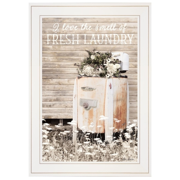 Add an air of fashion to your room and rejuvenate the space with this fresh laundry 1 white framed print bathroom wall art. This print is a visual artistic expression that allows you to decorate your space in style. Reproduced for you on paper, this hanging decorative accent will be a trendy and fashionable way to dress your walls. Hang on your wall to add some up to date fashion and decoration. Instantly liven up your space with this art that brings color and dimension to your walls. 21-inch H x 15-inch W x 1-inch D