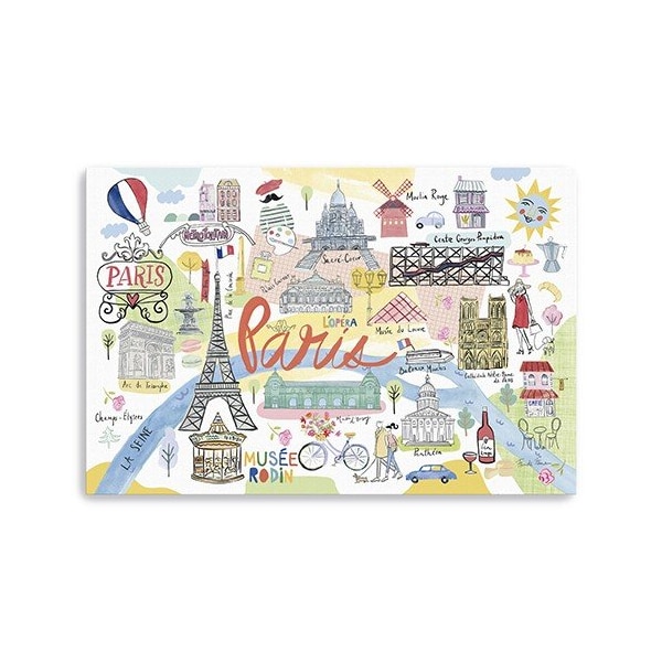 Add an air of fashion to your room and rejuvenate the space with this fun illustrated paris map unframed print wall art. This print is a visual artistic expression that allows you to decorate your space in style. Reproduced for you on canvas, this hanging decorative accent will be a trendy and fashionable way to dress your walls. Adding this hanging wall art to your space to make your room feel more finished and attractive. Utilize this opportunity to create a focal point in the room with this fabulous wall decor option. 24 inches H x 16 inches W x 1.25 inches D