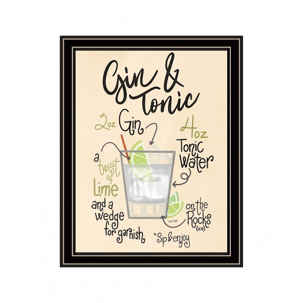 Add an air of fashion to your room and rejuvenate the space with this gin and tonic 1 black framed print wall art. This print is a visual artistic expression that allows you to decorate your space in style. Reproduced for you on wood, this hanging decorative accent will be a trendy and fashionable way to dress your walls in a rustic and modern farmhouse vibe. Hang on your wall to add some up to date fashion and decoration. Utilize this opportunity to create a focal point in the room with this fabulous wall decor option. 18-inch H x 14-inch W x 1-inch D