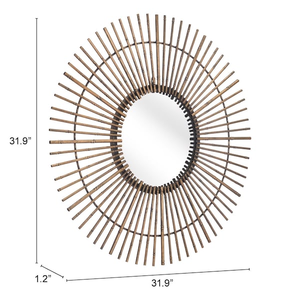 This gold tribal round mirror is the perfect way to add some depth and rustic elegance to your home. The frame is made from stainless steel and features a tribal design with spikes in a round formation around the mirror in the middle. The spikes are finished off with a dull gold matte color which adds to the tribal look of the mirror. The round mirror is encircled by a border with the spikes covering most of it. This mirror will look great in any room as it is minimal yet manages to make a statement. A hardware kit is included in the package to assist you in hanging the mirror. Product 31.9" H x 31.9" W x 1.2" D. Mirror 28" H x 16" W
