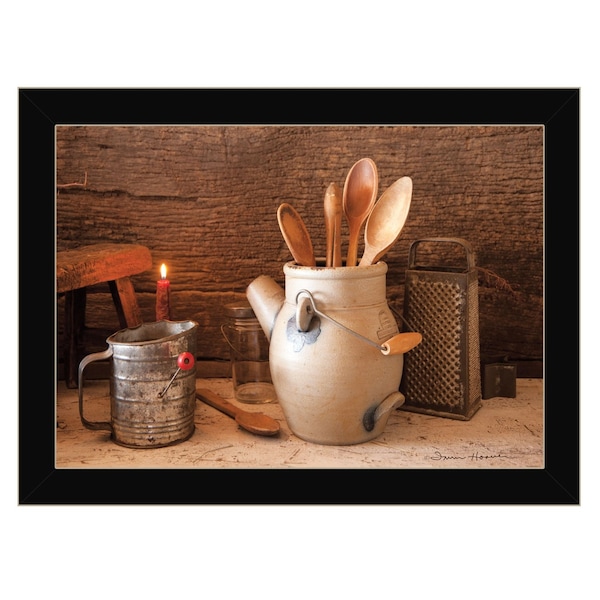 This grandmas kitchen tools 1 black framed print kitchen wall art will add a beautiful decorative accent to your decor. This print is a visual artistic expression that allows you to decorate your space in style. Reproduced for you on paper, this hanging decorative accent will be a trendy and fashionable way to dress your walls. Adding this hanging wall art to your space to make your room feel more finished and attractive. Instantly liven up your space with this art that brings color and dimension to your walls. 14-inch H x 20-inch W x 1-inch D