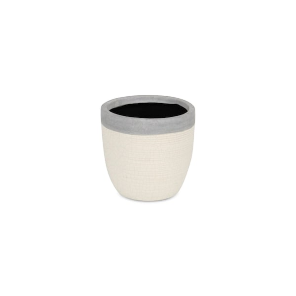 The gray and ivory ceramic 41 ounce crackle round distressed pot planter is a stunning addition to any indoor space. This round pot planter features a beautiful crackle reactive glaze that adds charm and character to your decor. Made from durable ceramic, it combines both aesthetics and functionality, making it perfect for showcasing your favorite greenery. The purposeful distressing technique ensures that each piece is unique, enhancing its artisanal appeal. With an interior height of 3.75 inches, this planter is just the right size for small to medium plants, offering a stylish home for your botanical treasures. Elevate your living space with this eye-catching planter that beautifully complements any interior style. 4.00-inch h x 4.25-inch w x 4.25-inch d.