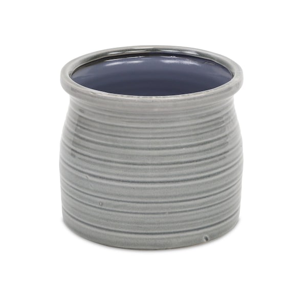 The gray ceramic 51 ounce striped round distressed pot planter serves as a stylish home for your indoor plants. Crafted from durable ceramic, this planter features a charming round shape that complements various decor styles. Its curved neck, tonal stripes and purposeful distressing provides a unique vintage look, enhancing the aesthetic of any room. With an interior height of 4.75 inches, it accommodates a variety of plants, allowing you to showcase your green thumb. This handmade planter adds a touch of earthy artisanal style to your living space while ensuring optimal growth for your favorite foliage. Use it to elevate your home decor and create an inviting atmosphere that celebrates nature indoors. 5.50-inch h x 6.25-inch w x 6.25-inch d.