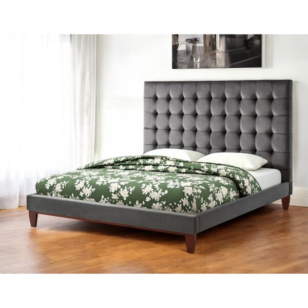 Add a luxuriously appointed bed that will help you create an oasis of comfort and relaxation in your home with this gray solid wood king tufted upholstered velvet bed. This fully upholstered bed frame is covered in a beautiful button tufted gray velvet that brings a unique and special touch to your room. We spend so much time in our bedrooms, thus making quality craftsmanship and good looks vitally important. This bed is the perfect way to make your bedroom comfortable and inviting. 60.3-inch H x 89-inch W x 82.3-inch D