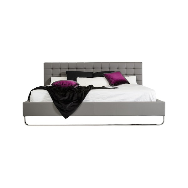 The modern grey leatherette eastern king bed is the ultimate combination of comfort and style. Fully upholstered in a gray button tufted faux leather, this bed brings a unique and designer perspective to your space. This bed will help to create a peaceful environment that will provide restful slumber for years to come. We spend so much time in our bedrooms, thus making quality craftsmanship and good looks vitally important. 40.00-inch h x 84.00-inch w x 89.00-inch d.