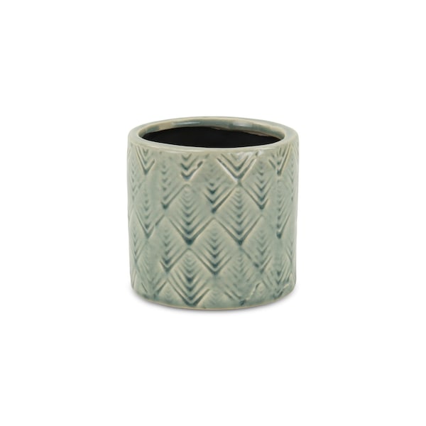 The green ceramic 16 ounce geometric round distressed pot planter adds a touch of elegance to any indoor space. This round pot is made from high-quality ceramic that is both durable and stylish. Features a gorgeous tonal and reactive reactive glaze, a unique geometric arrows design, and purposeful distressing that enhances its character. With an interior height of 4 inches, this planter is perfect for small plants or vibrant succulents, making it an ideal choice for tabletops or shelves. Its geometric design complements various styles while providing a stylish home for your greenery. Transform your living area with this eye-catching piece that not only serves a practical purpose but also elevates your interior design. 4.25-inch h x 4.50-inch w x 4.50-inch d.