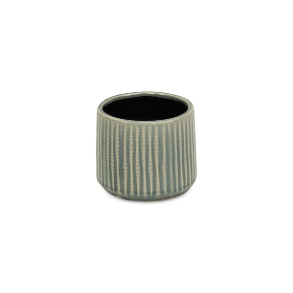 The green ceramic 25 ounce striped round distressed pot planter adds a touch of nature to any indoor space. Crafted from high-quality ceramic, this planter features a charming round shape that perfectly complements any decor style. The tonal geometric lines striped pattern, reactive glaze, and purposeful distressing adds character, making each piece unique and visually appealing. With an interior height of 5 inches, it provides ample space for your plants to thrive while maintaining a neat appearance. This handmade planter not only serves a functional purpose but also elevates the aesthetic of your living space. 4.25-inch h x 4.75-inch w x 4.75-inch d.